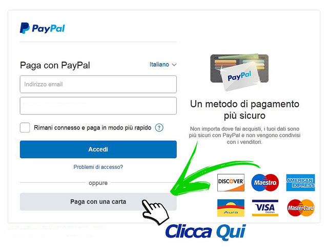 Pagamenti sicuri con carta di credito : Discover, Carta Aura, Maestro, Visa, MasterCard, American Express, tramite Paypal ma senza iscrizione o account PayPal.